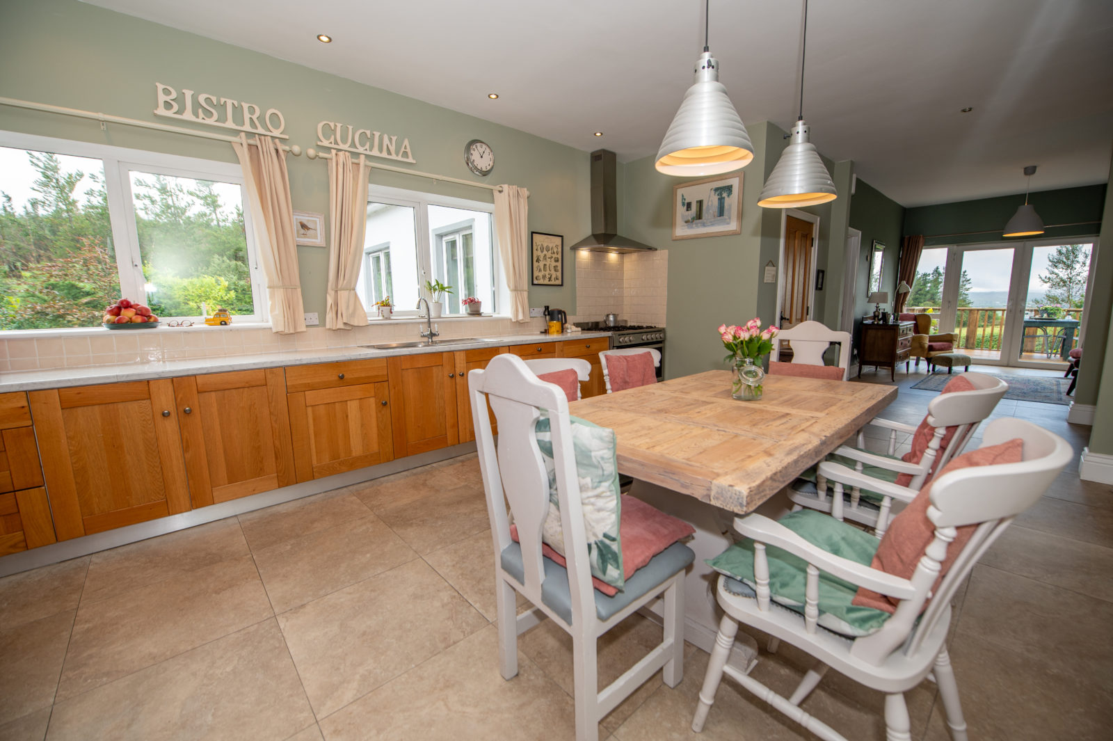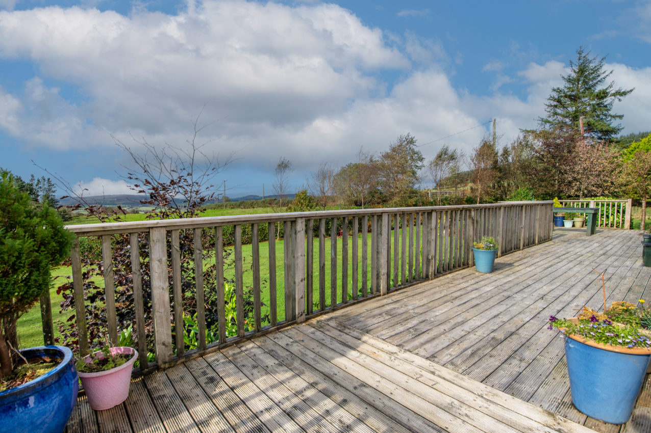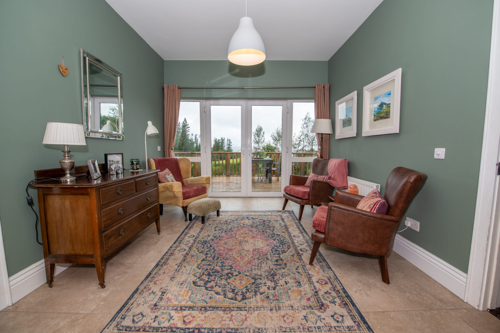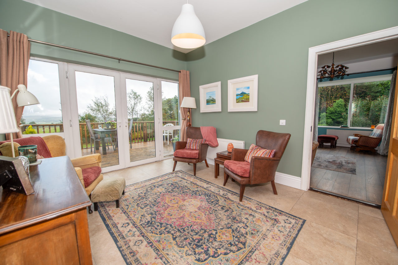 Family Room; 3.86m x 3.20m spectacular far-reaching rural views and opens via double fully glazed PVC doors onto a wraparound deck, door to;