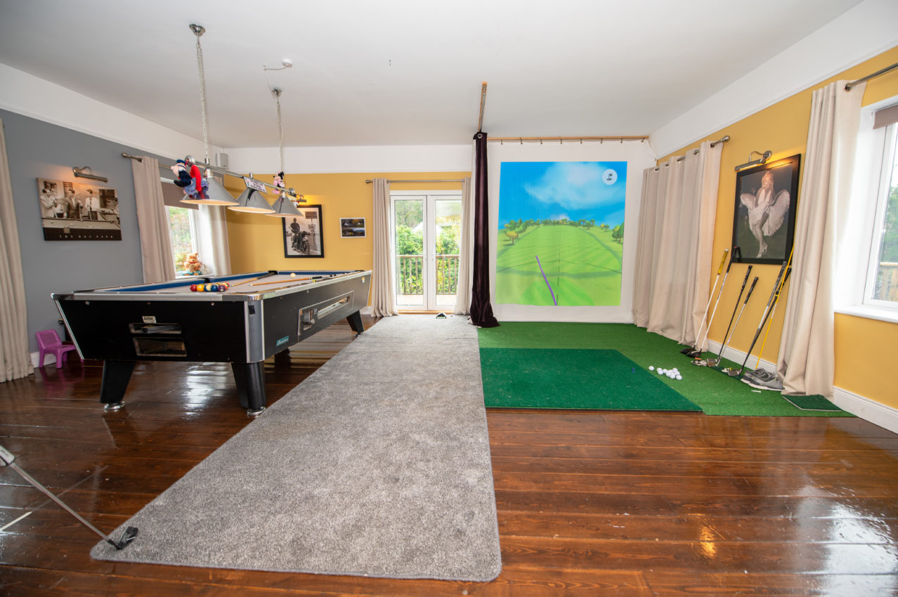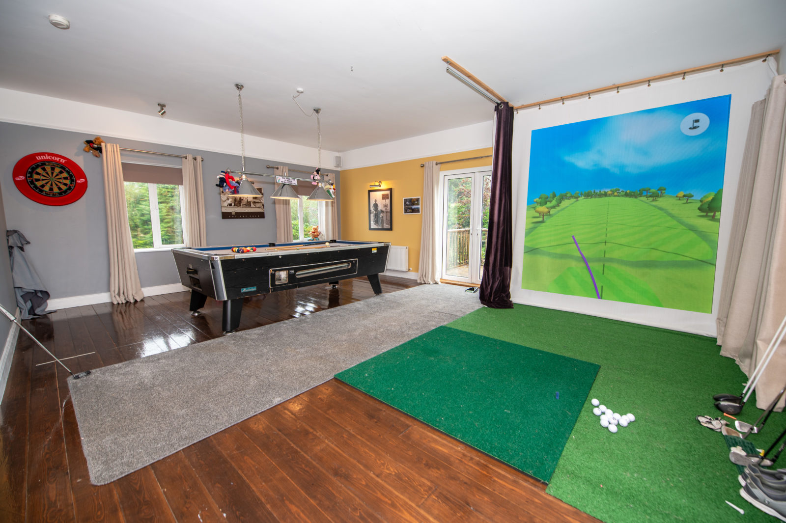A standout feature of the property is the dedicated leisure suite, complete with American pool table, darts area, and a full golf simulator—creating a unique private retreat within the home.