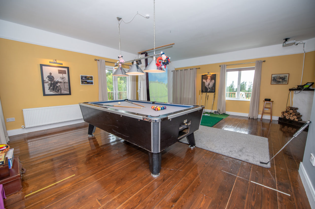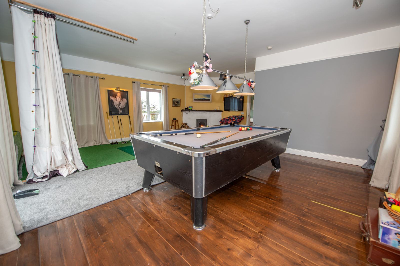 Games Room; 6.86m x 7.01m spacious room with timber flooring, Pool table, darts board, golf simulator, TV point, double fully glazed doors to wraparound decking