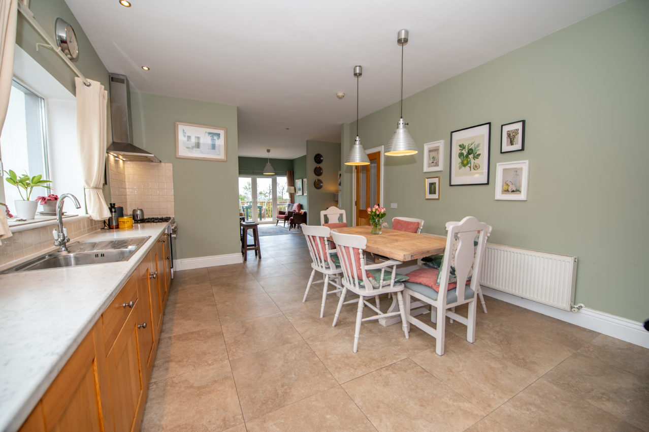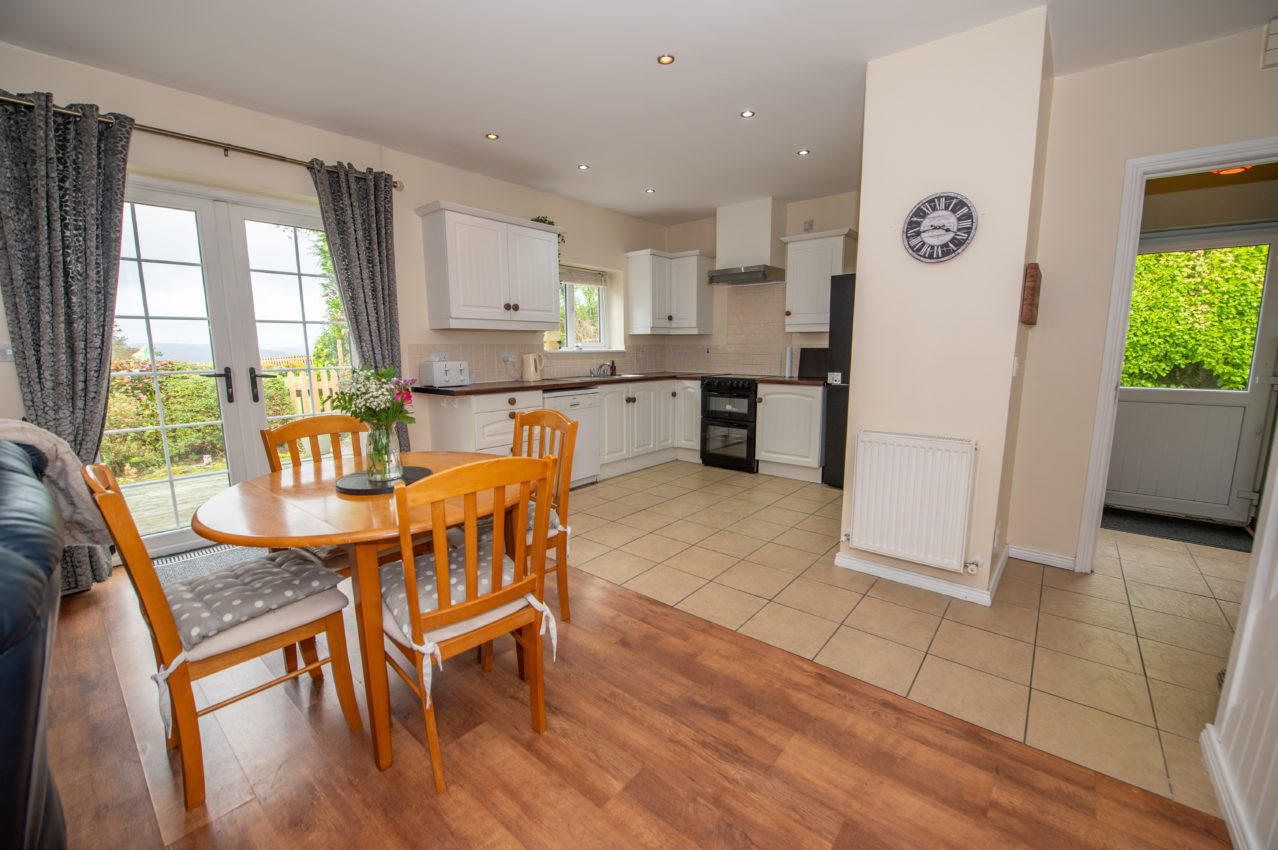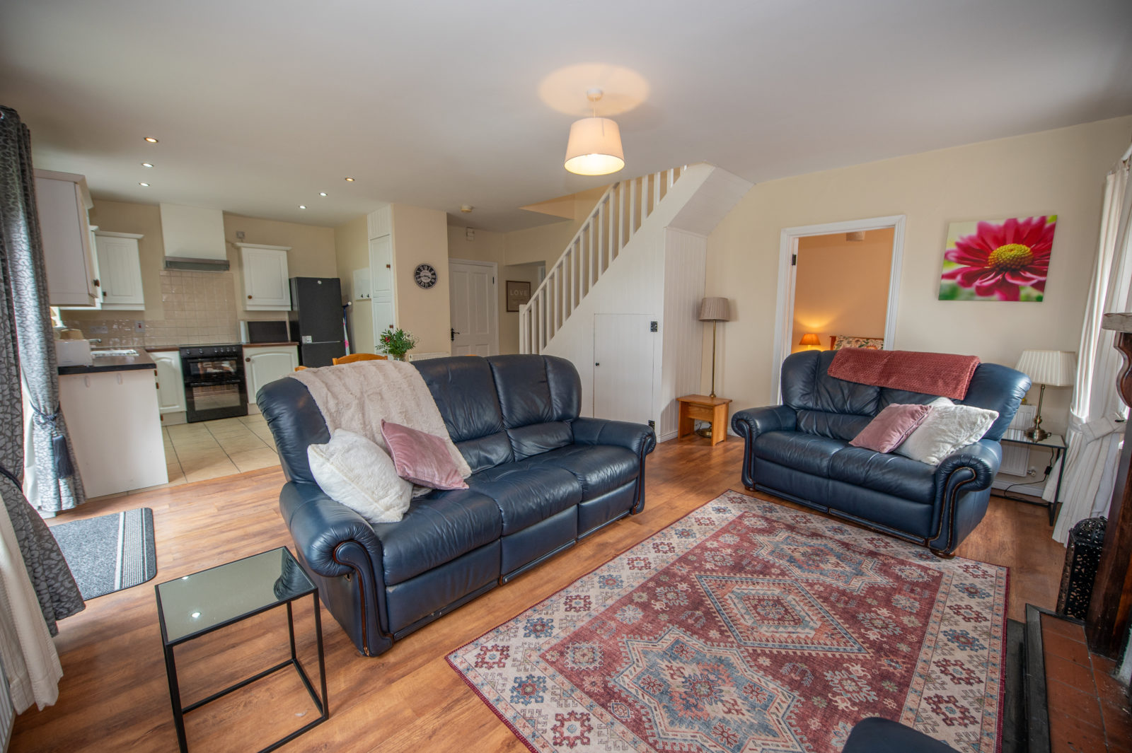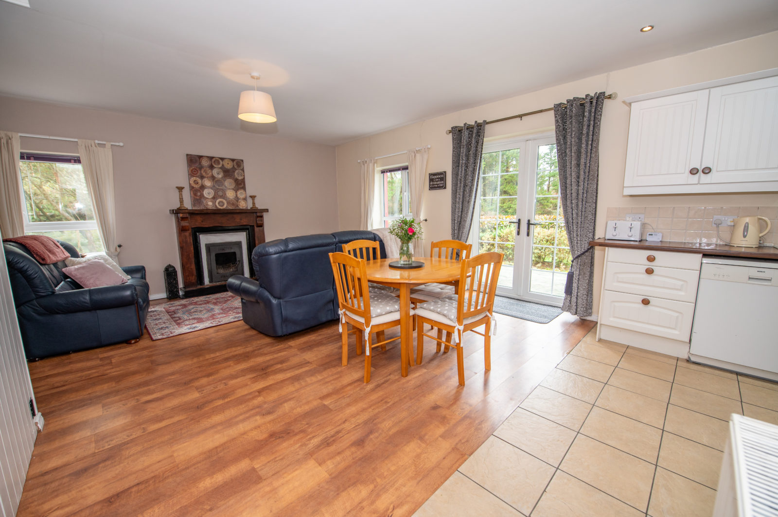 Open Plan Kitchen / Living / Dining Area; bright and spacious open-plan layout with fitted wall & base units, work surfaces with tiled surrounds, stainless steel sink, electric cooker point, tiled flooring to kitchen area and laminated flooring to living/dining space, mahogany fireplace with solid fuel fire, double aspect windows, built-in storage under stairs, double fully glazed doors to outside, door to;