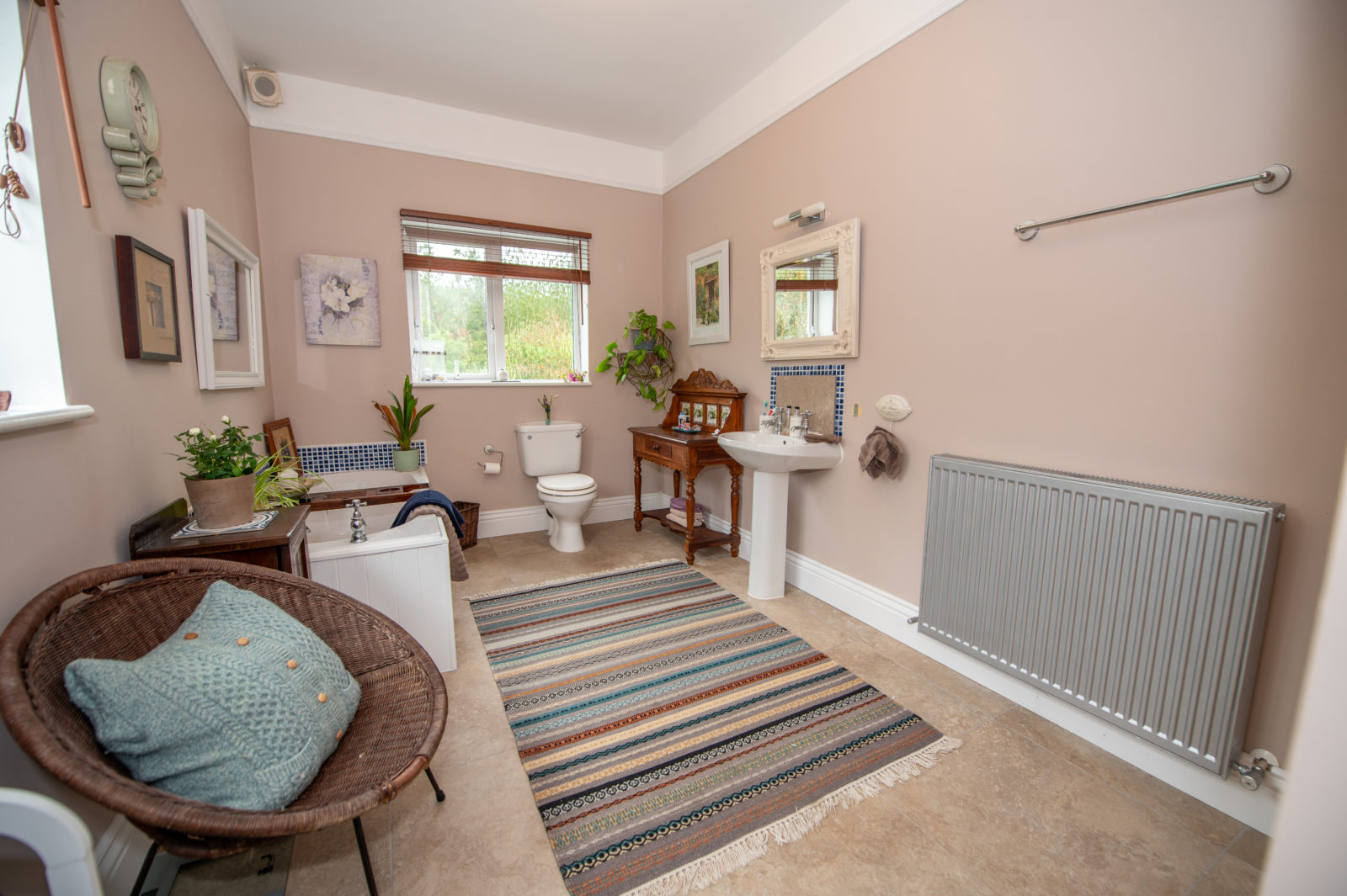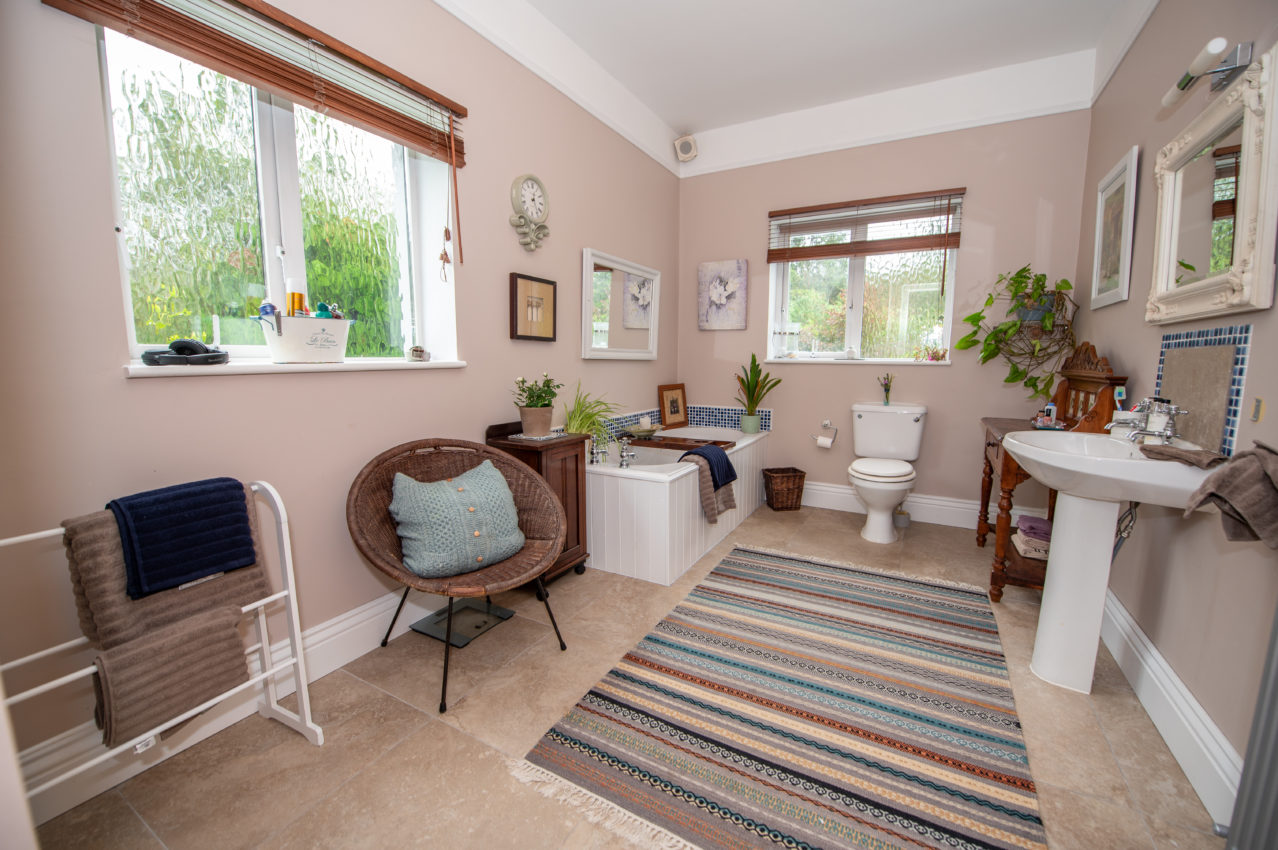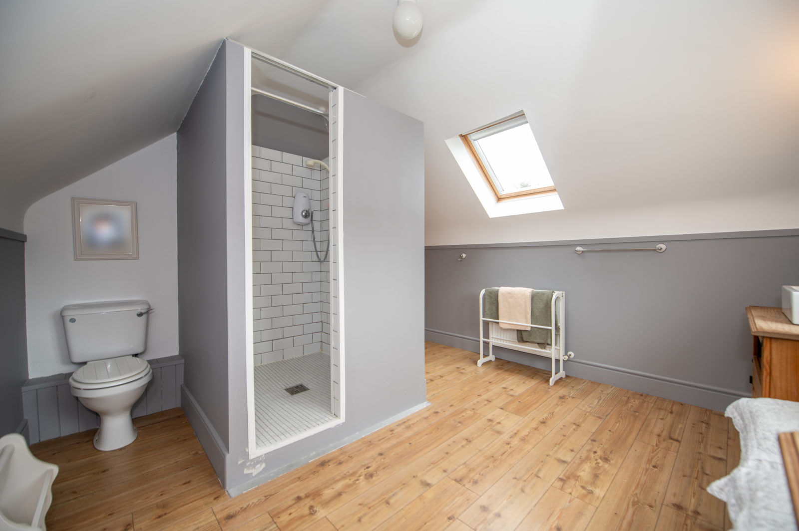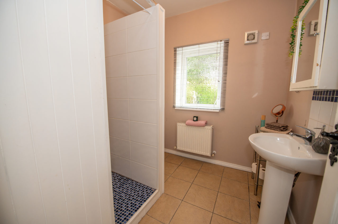 Family Bathroom; 2.51m x 4.03m white three-piece suite with separate fully tiled walk-in shower enclosure, tiled splashback to wash hand basin, tiled flooring, heated towel rail