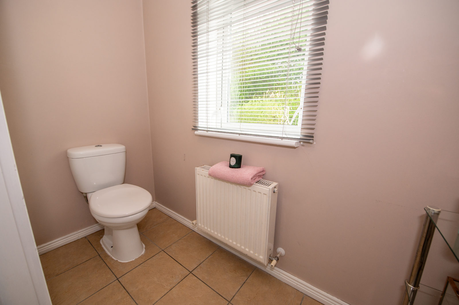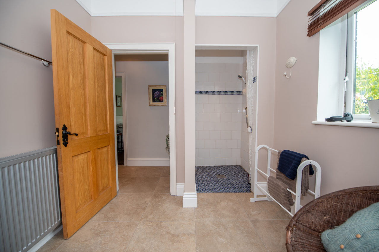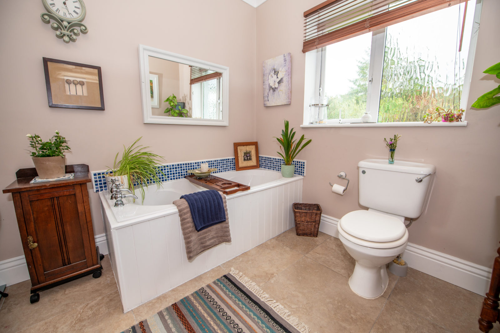 Family Bathroom; 2.51m x 4.03m white three-piece suite with separate fully tiled walk-in shower enclosure, tiled splashback to wash hand basin, tiled flooring, heated towel rail