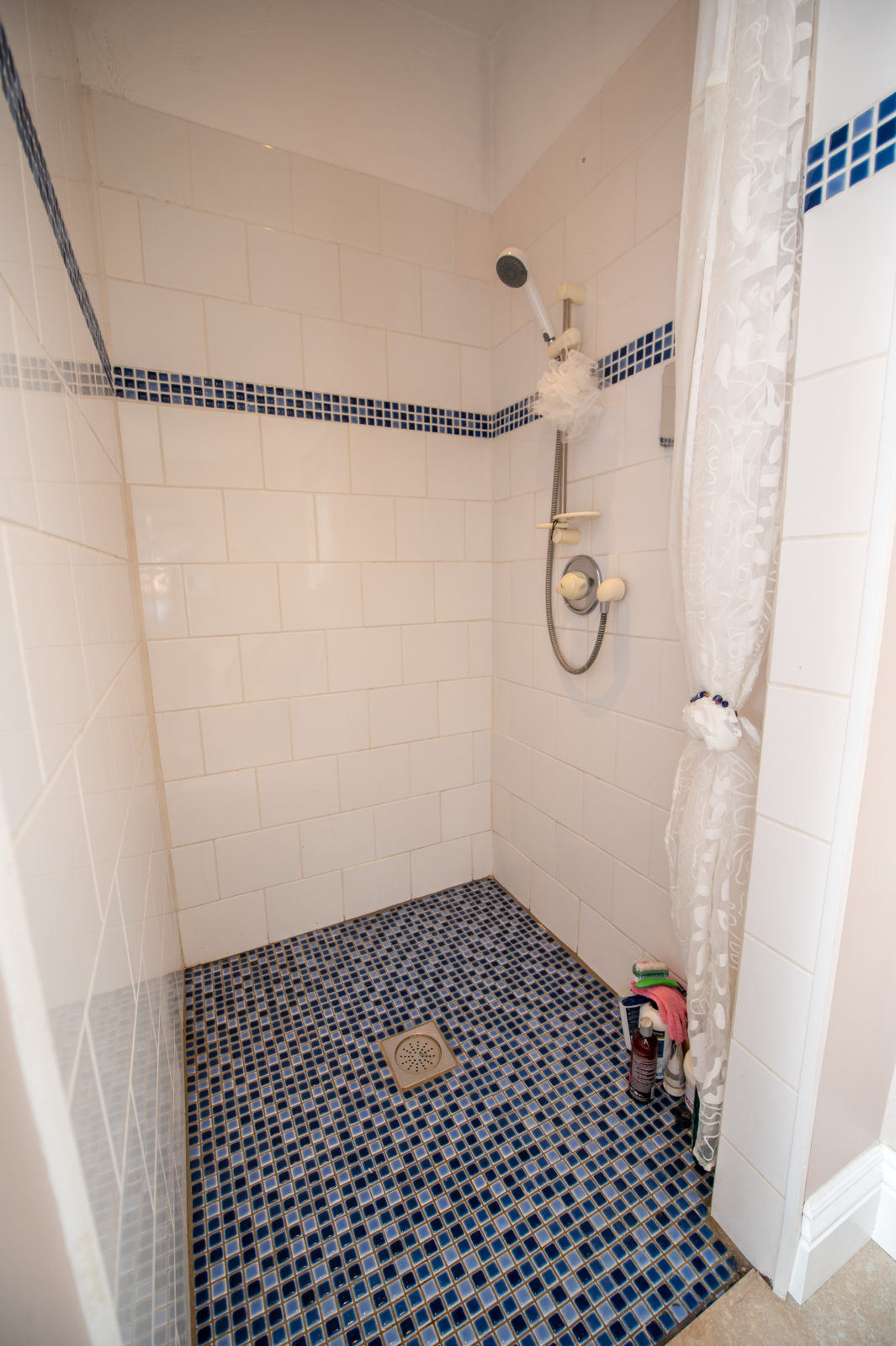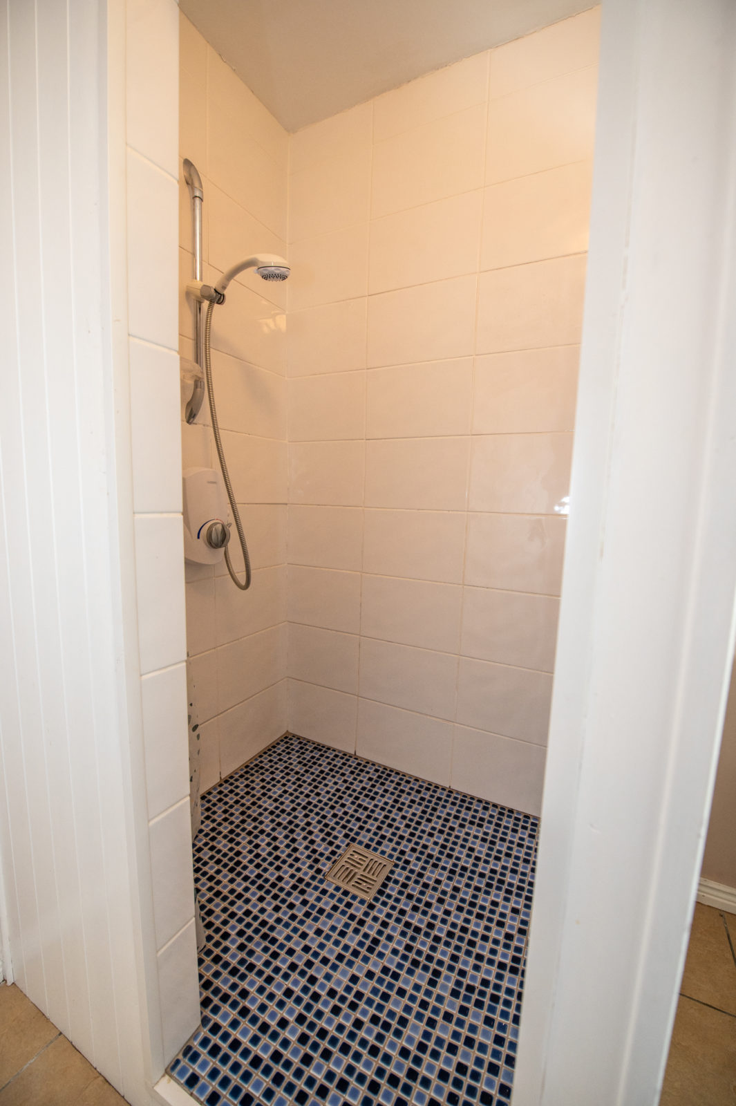 Shower Room; 2.24m x 2.34m white two-piece suite with separate fully tiled shower enclosure, tiled splashback, fitted mirrored cabinet, tiled flooring