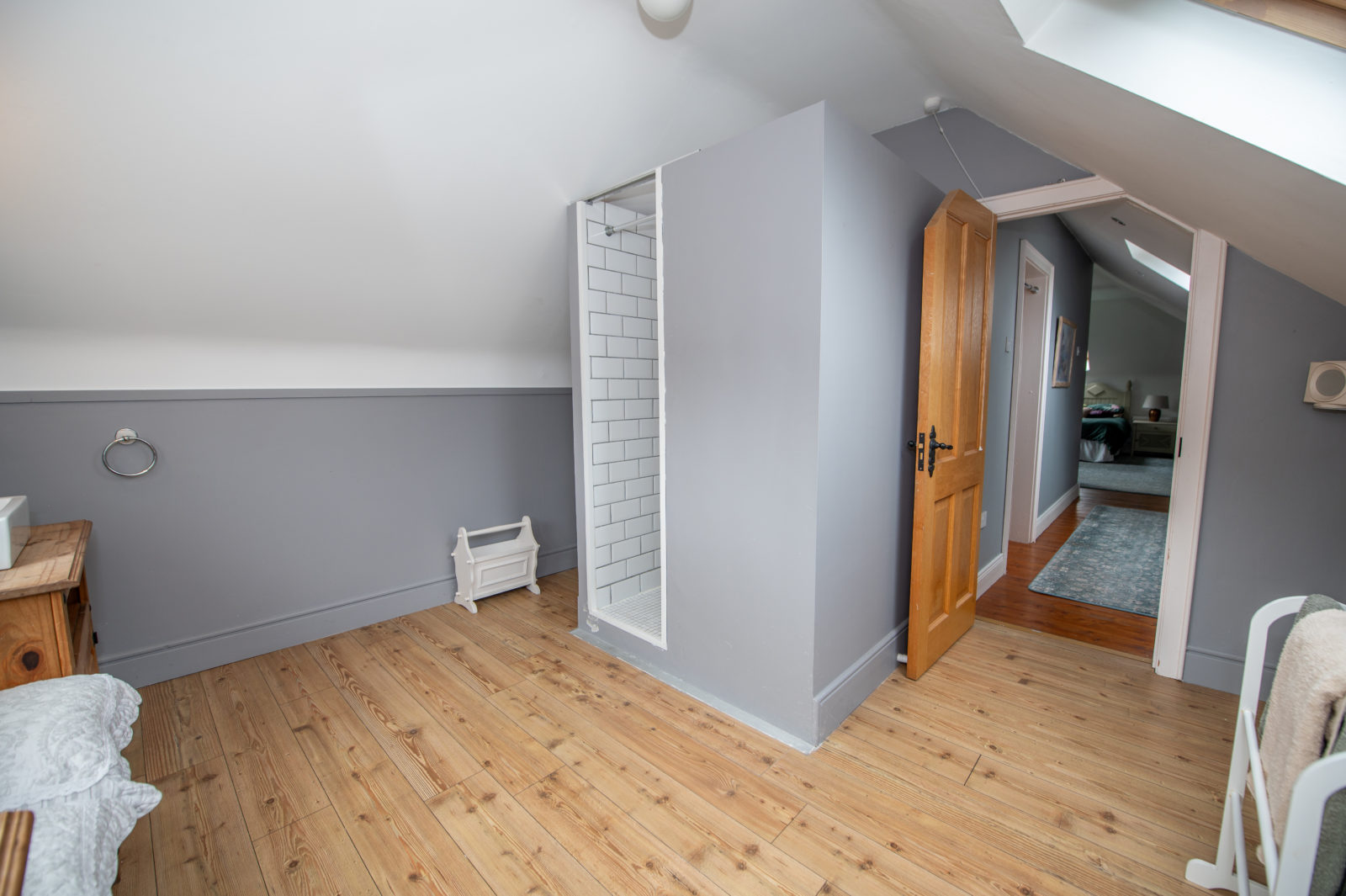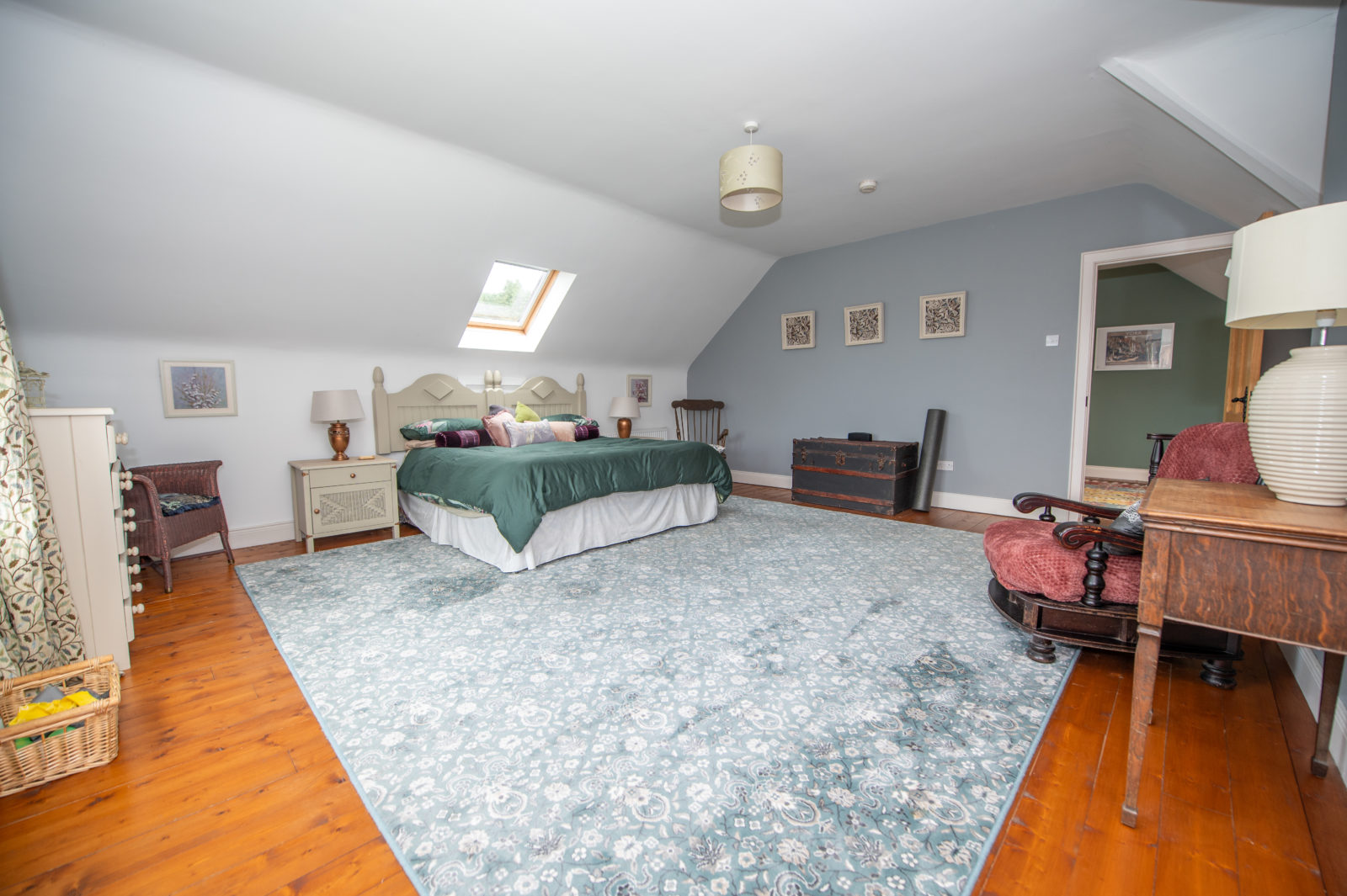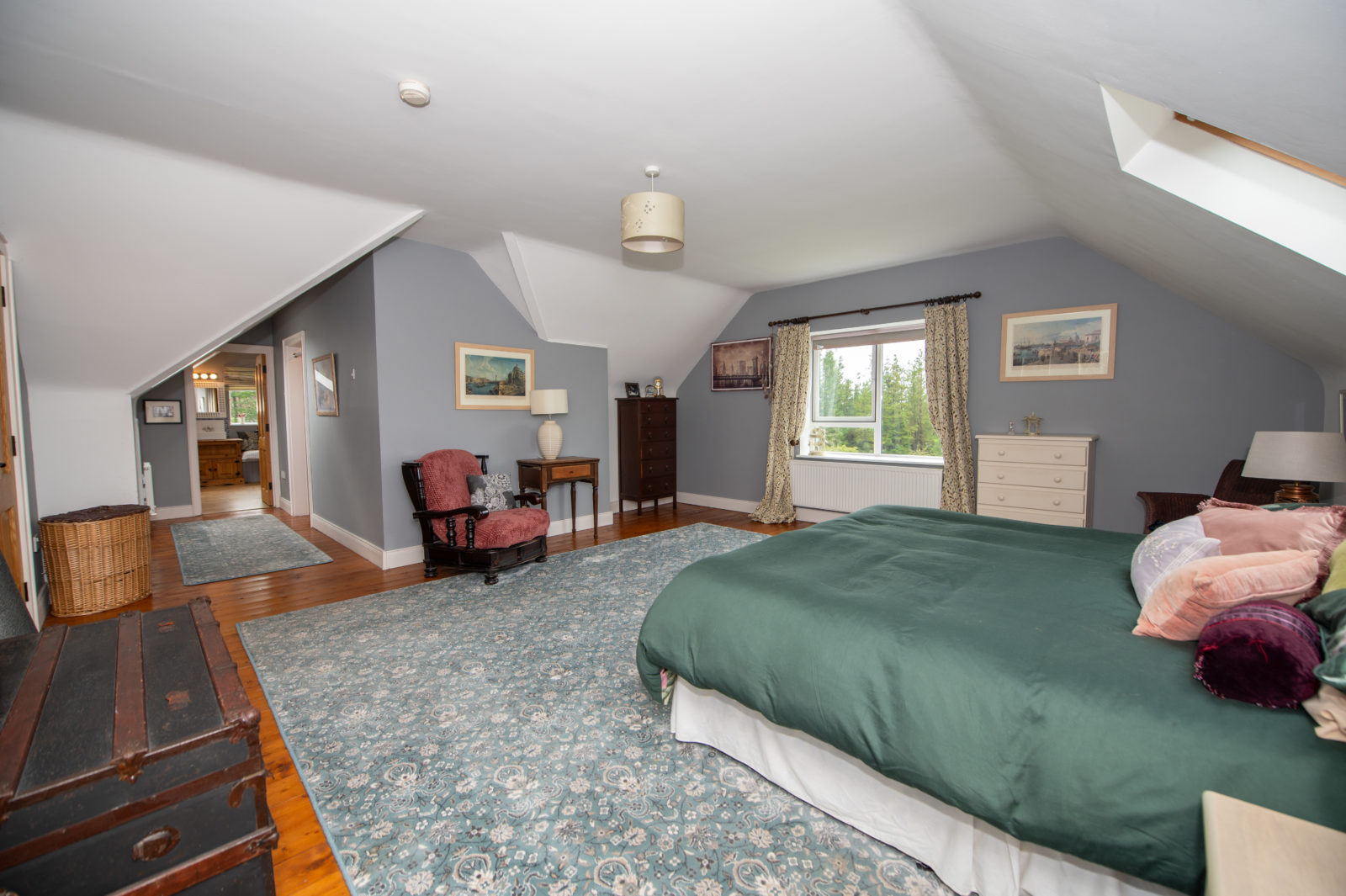 Master Bedroom Suite; 5.68m x 9.29m spacious room with timber flooring, velux window, stunning elevated views, separate doors to;