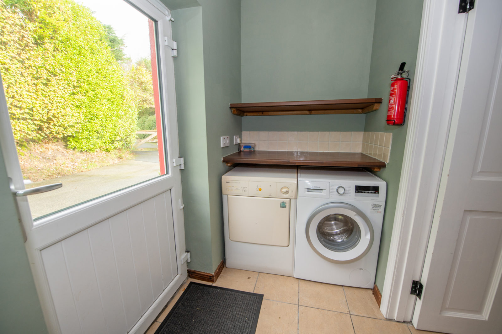 Entrance Vestibule / Utility Room; 2.68m x 1.22m plumbed for washing machine, space for tumble dryer, work surfaces, tiled splashbacks tiled flooring, door to;