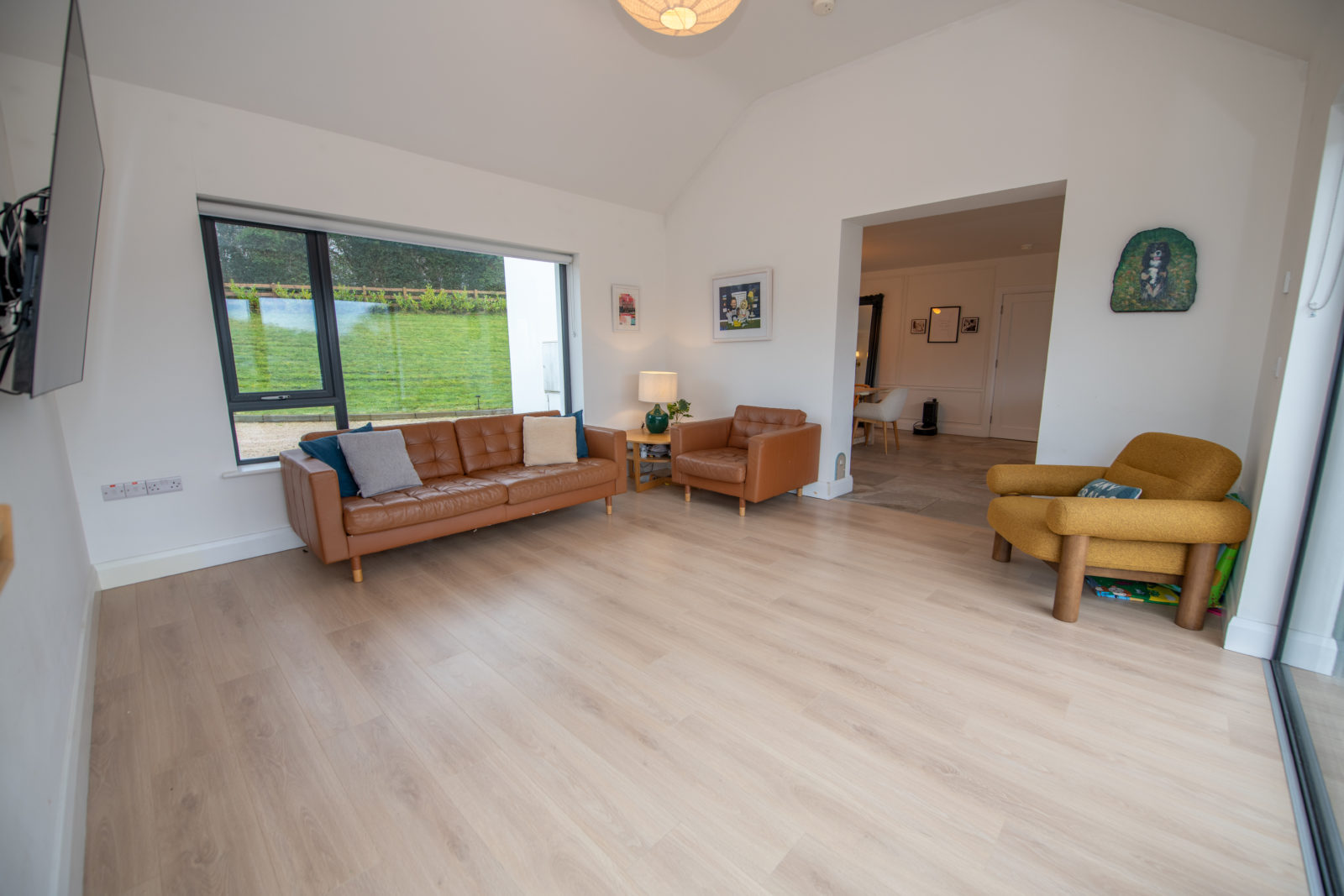 Sunroom; 4.26m x 4.31m A beautiful light-filled extension of the kitchen space, wide plank timber flooring, vaulted ceiling, TV point, fully glazed sliding doors leading to the patio & rear garden
