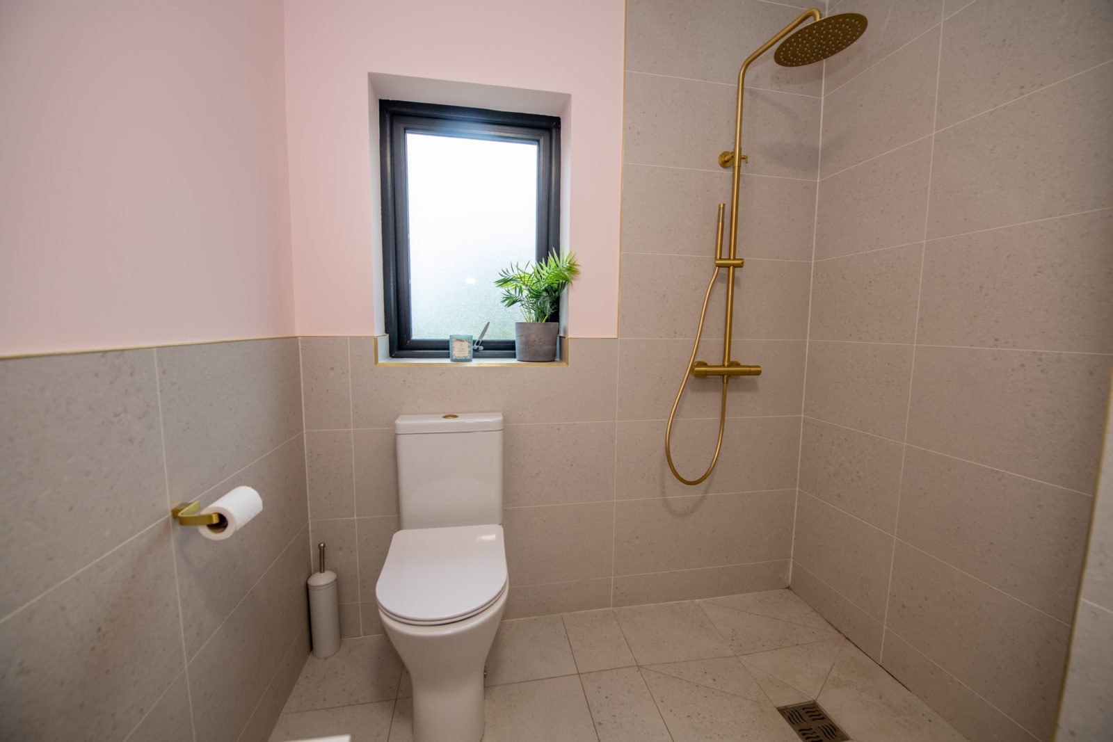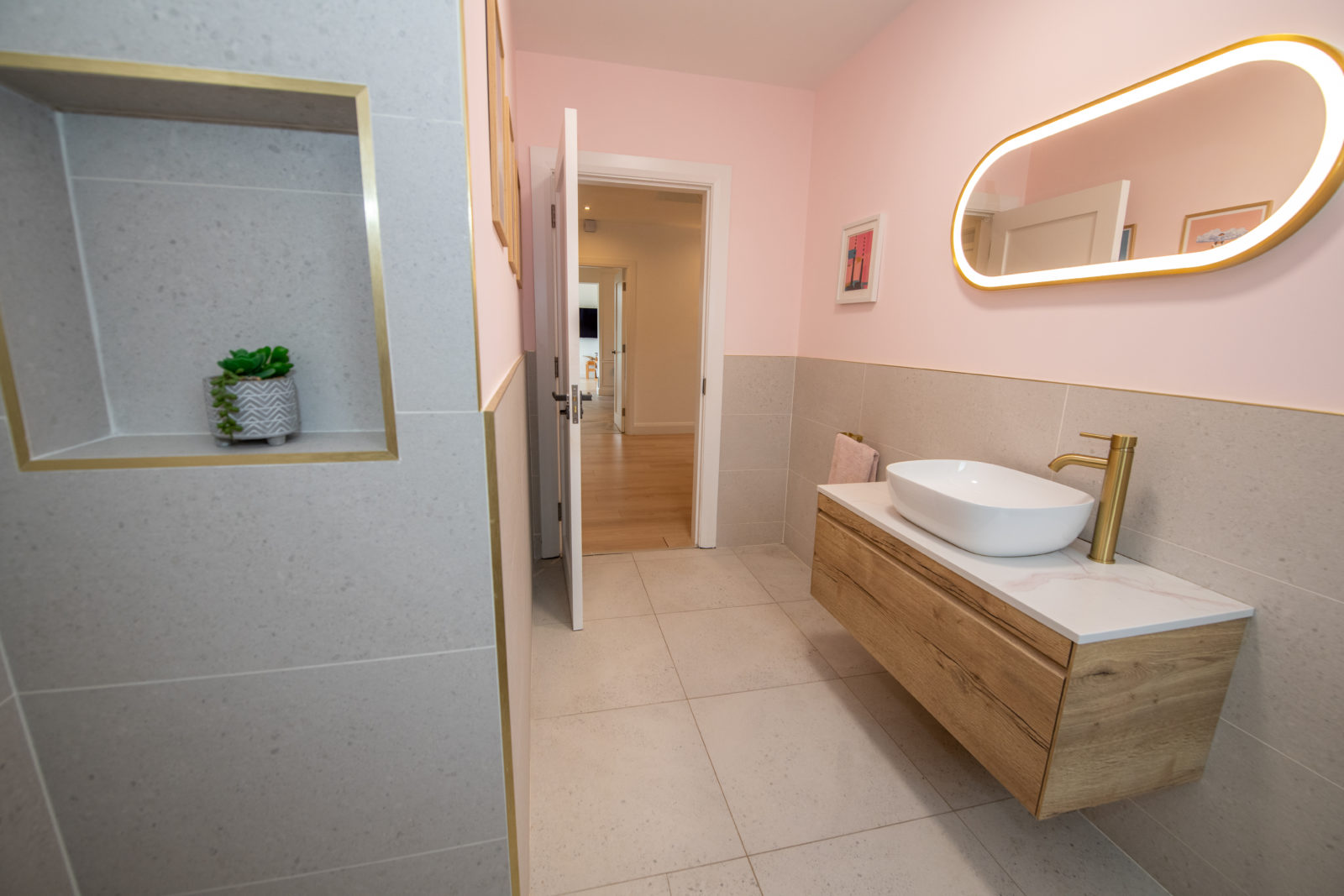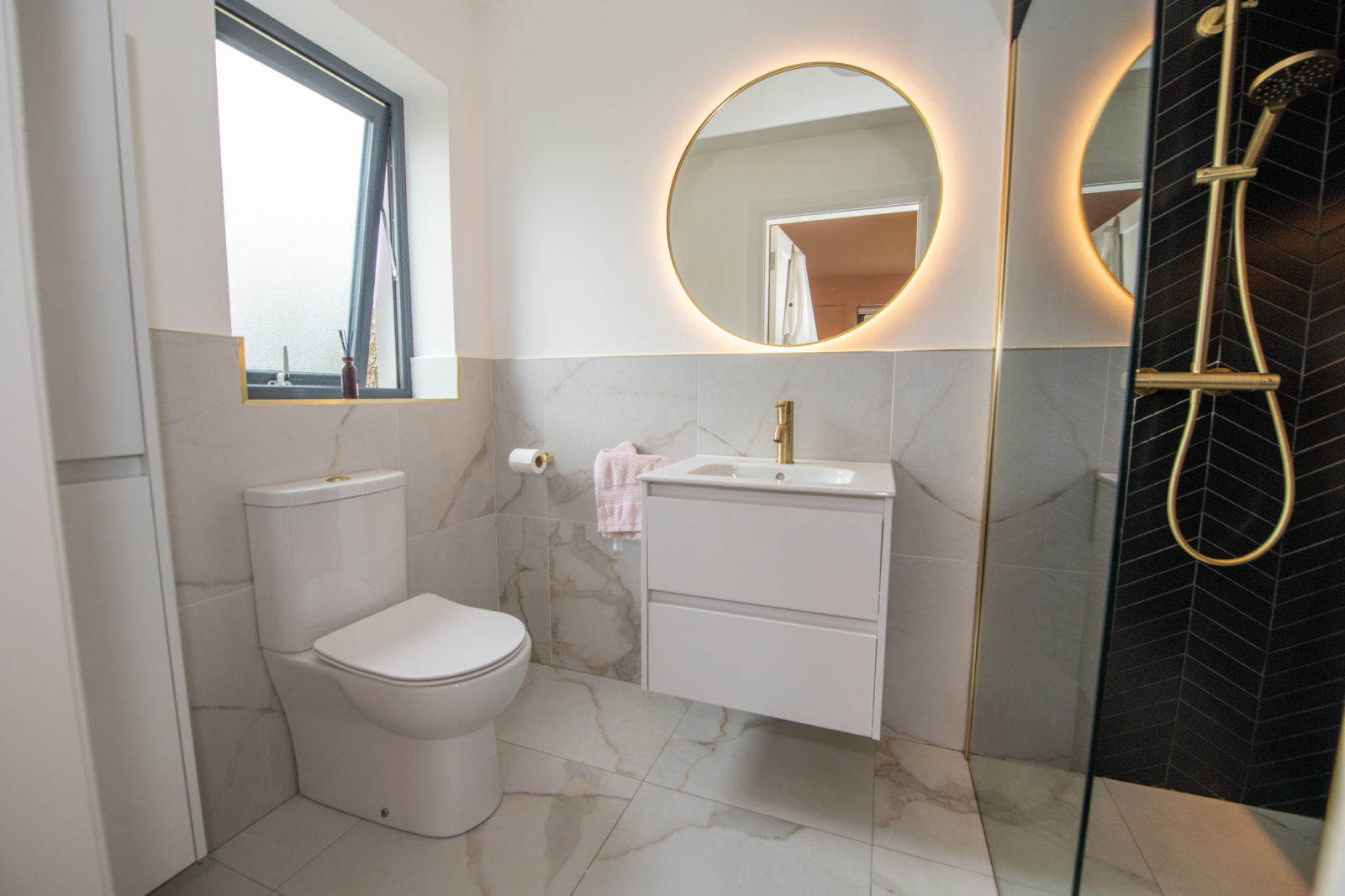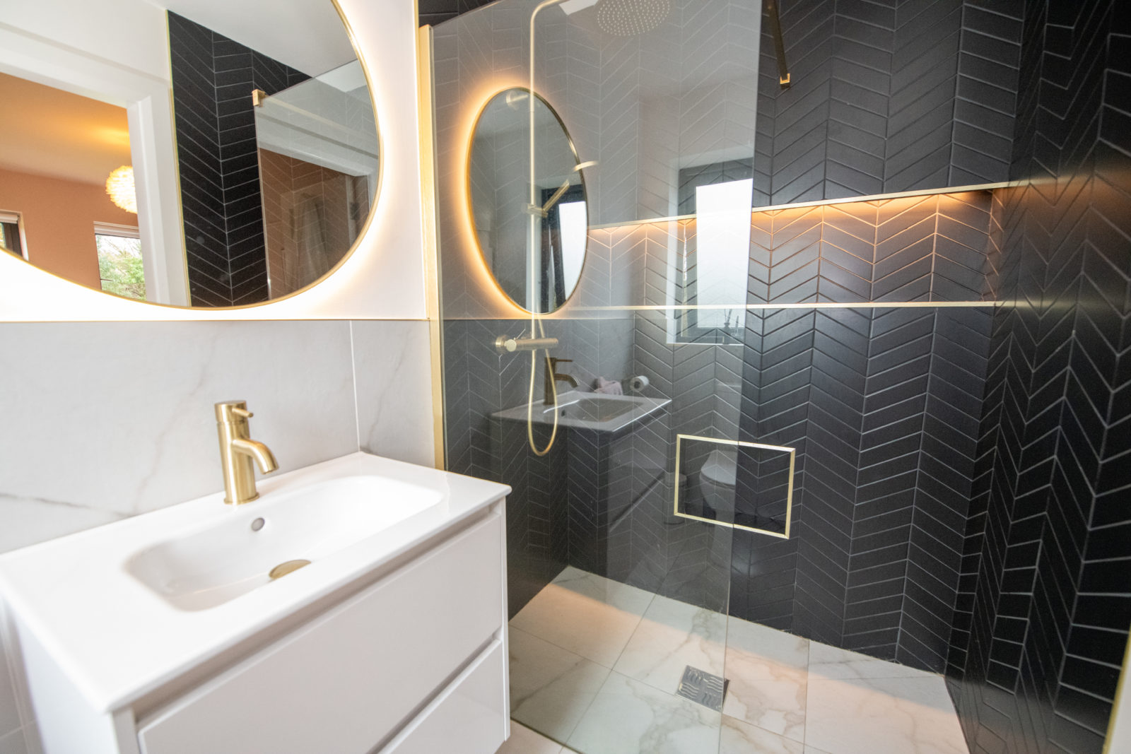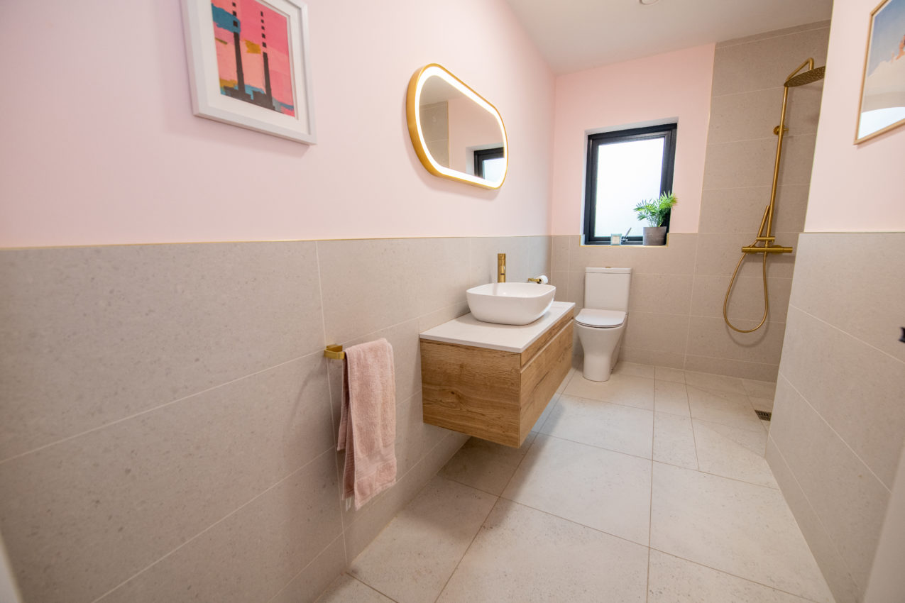 Luxury Ground Floor Shower Room; 3.47m x 2.06m beautifully finished with a white two-piece suite, fitted storage under wash hand basin, walk-in shower enclosure with fully glazed screen & elegant gold fittings, half-tiled walls, illuminated fitted mirror