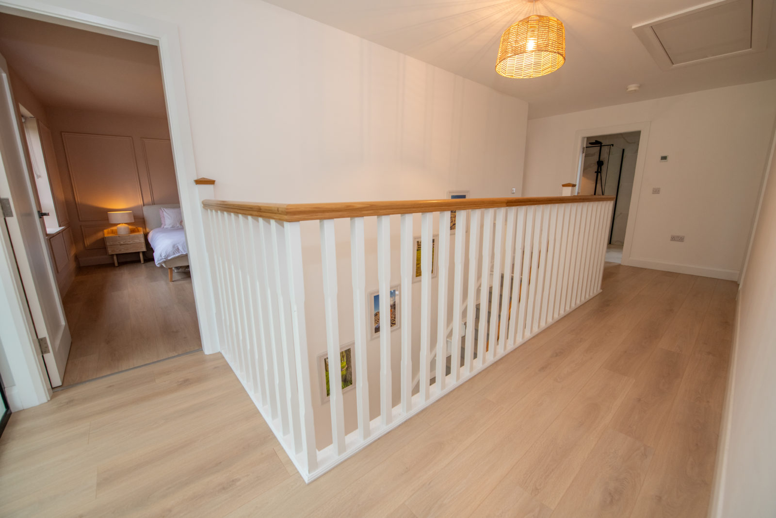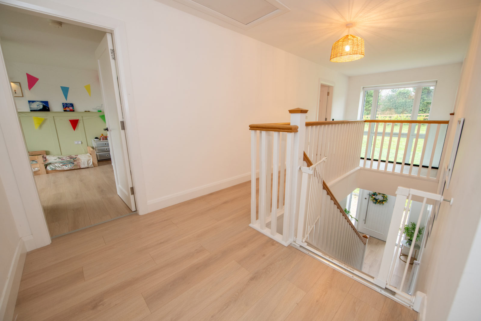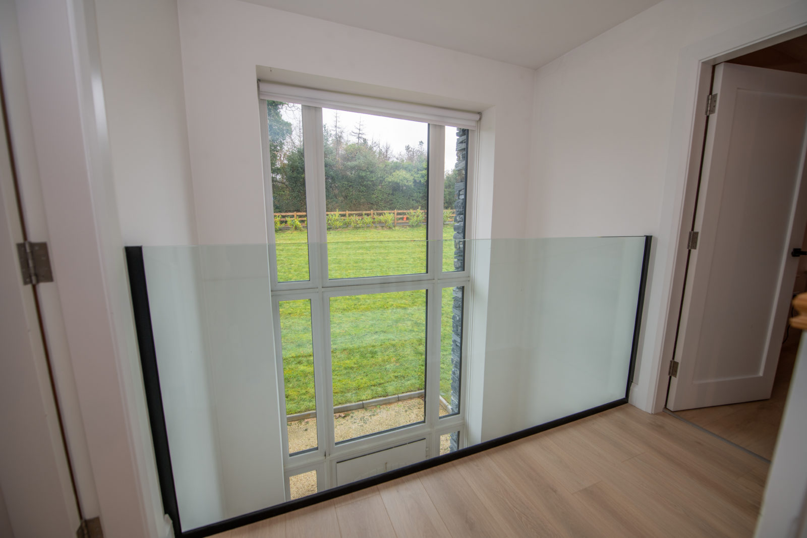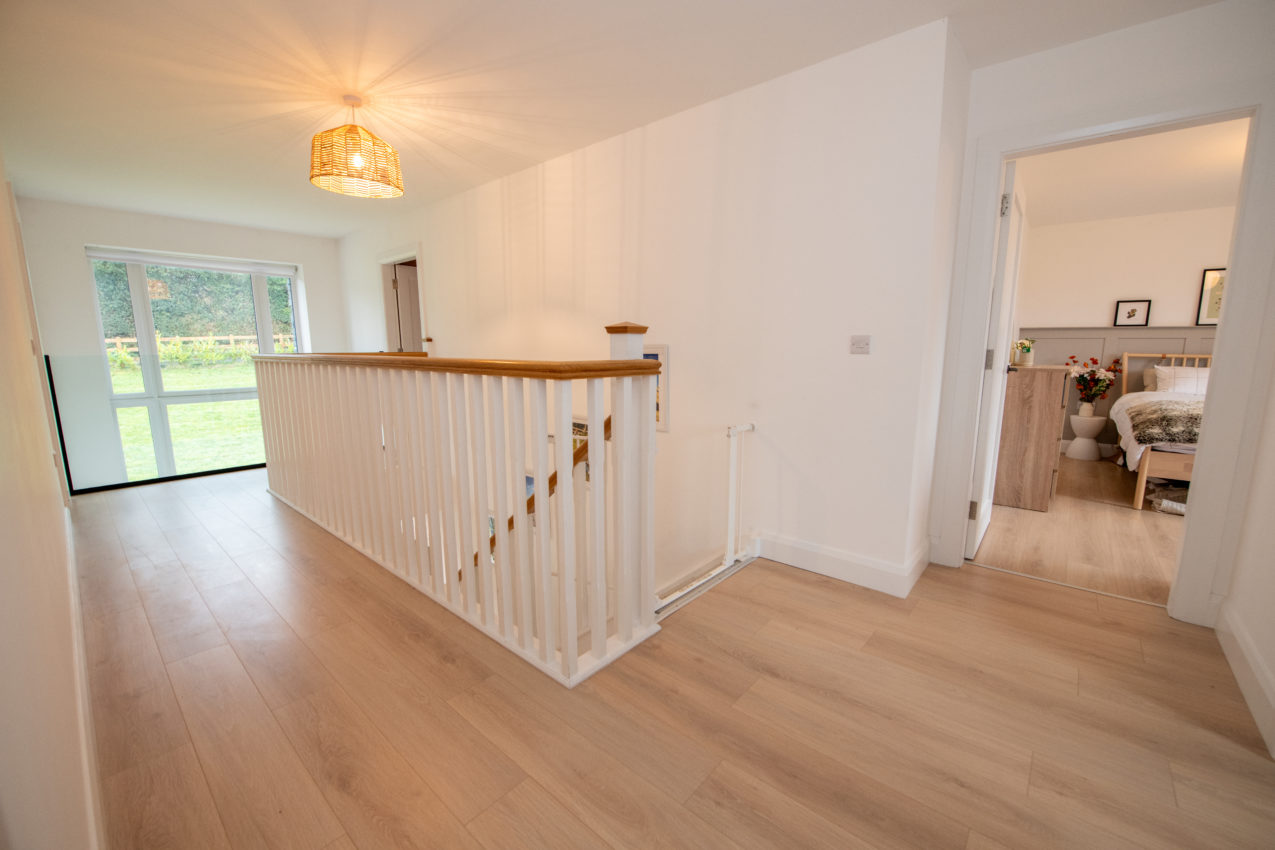 Landing; 3.05m x 6.52m a bright landing area with glazed wall panel overlooking the ground floor, loft access via ‘Stira’ staircase, wide plank timber flooring