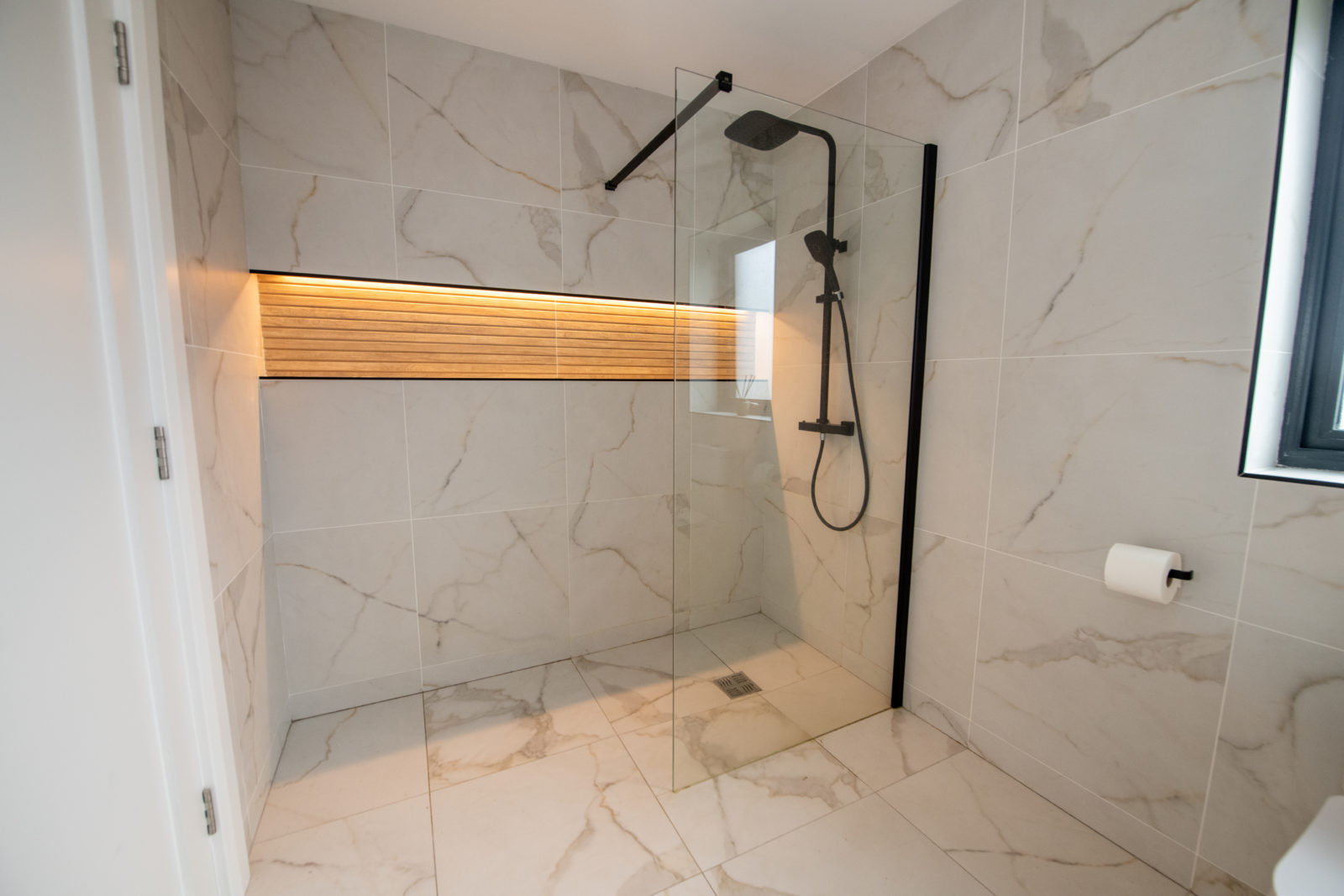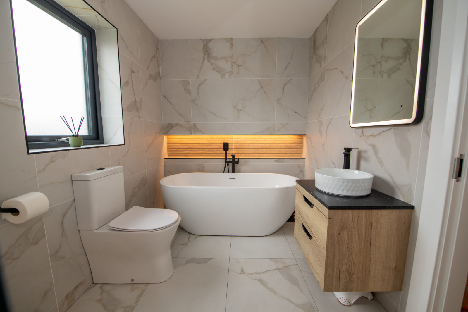 Luxury Family Bathroom; 3.76m x 2.09m impressive family bathroom with white three-piece suite, fitted storage under wash hand basin, fully tiled walk-in shower enclosure with glass screen, recessed shelving with feature lighting, illuminated touchscreen mirror.