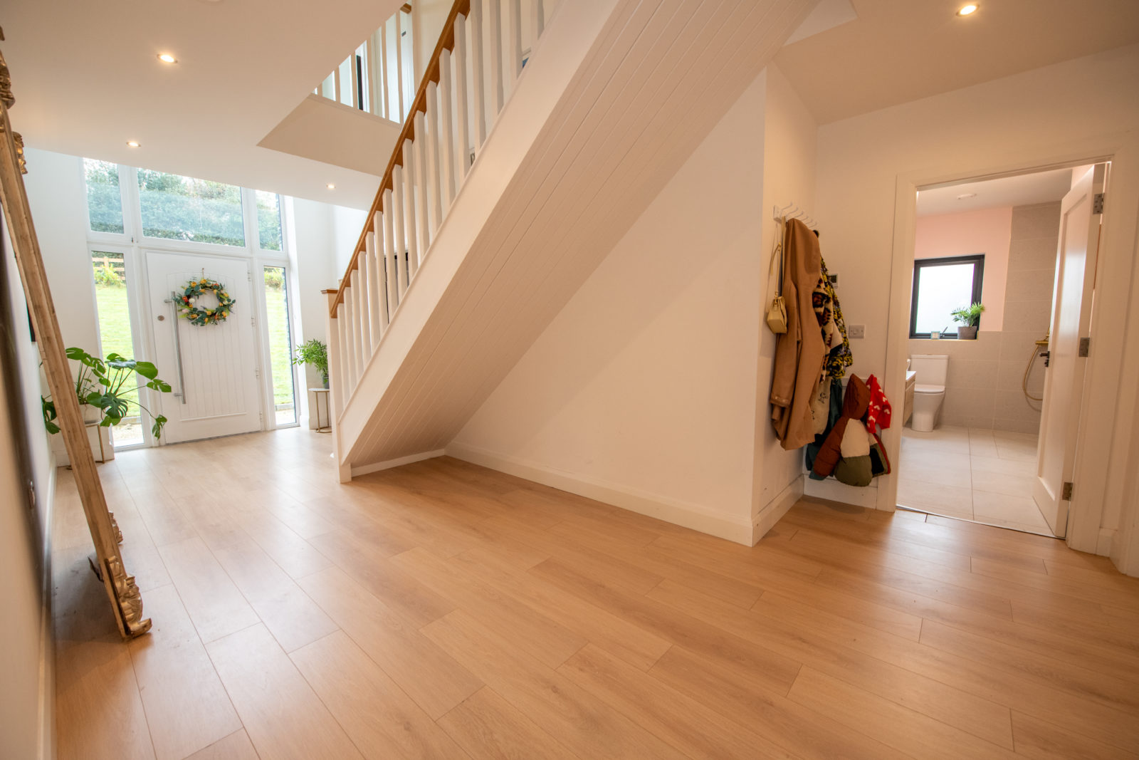 Entrance Hallway; 3.58m x 6.89m wide plank timber flooring, open understairs recess, fitted wall lighting, door to;