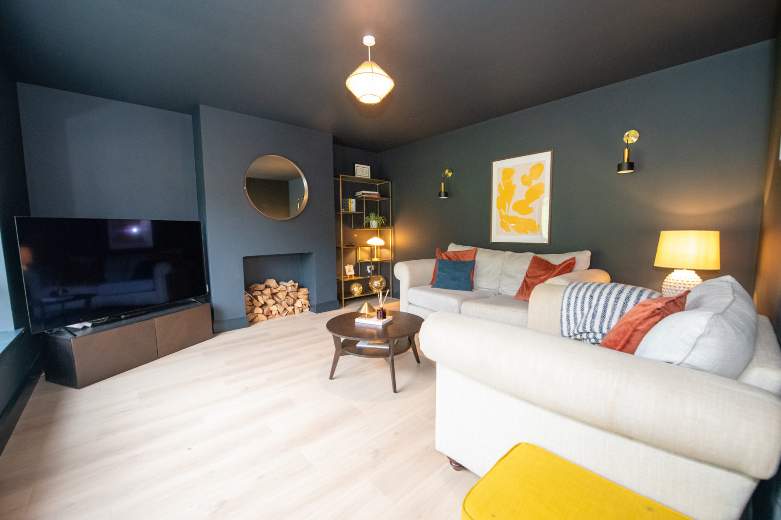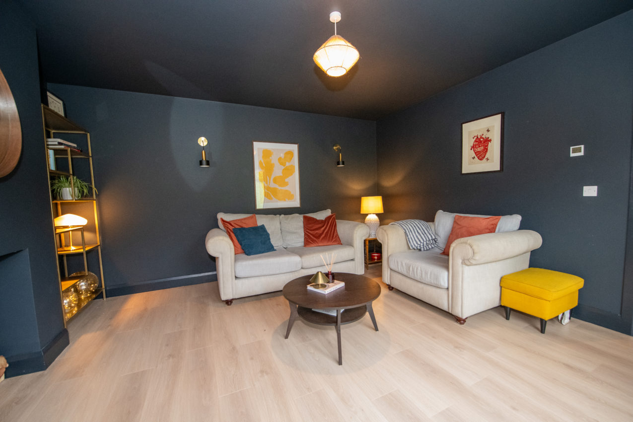 Living Room; 4.52m x 4.18m stylish & cosy reception room with wide plank timber flooring, dark feature walls & ceiling, fitted wall lights, TV point, provisions for an open fire (currently not in use)